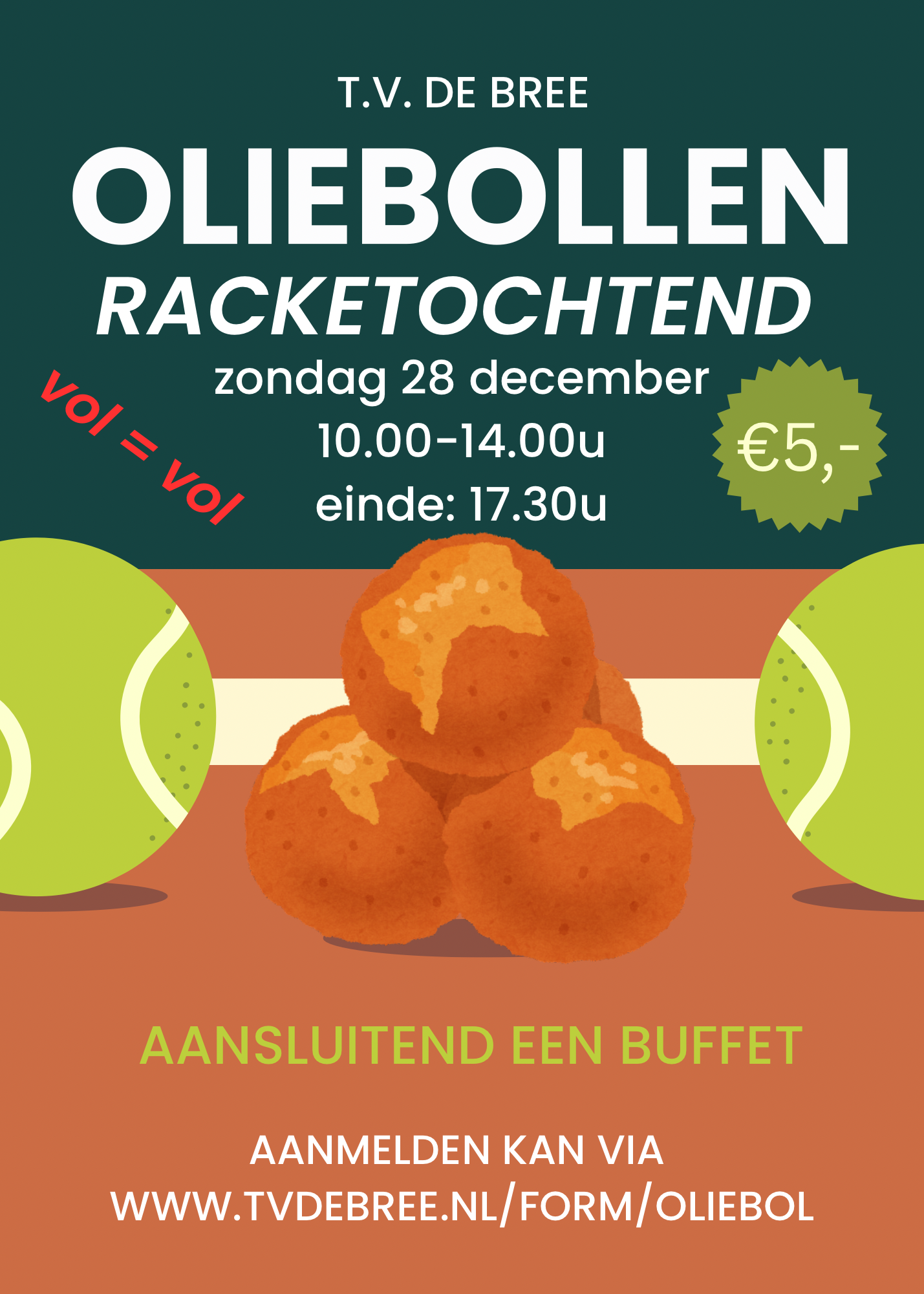 Aanmeldformulier voor de oliebollen racketochtend op 28 december 2025. Starten om 10.00u, tennissen tot 14.00u, vervolgens aansluitend een buffet.